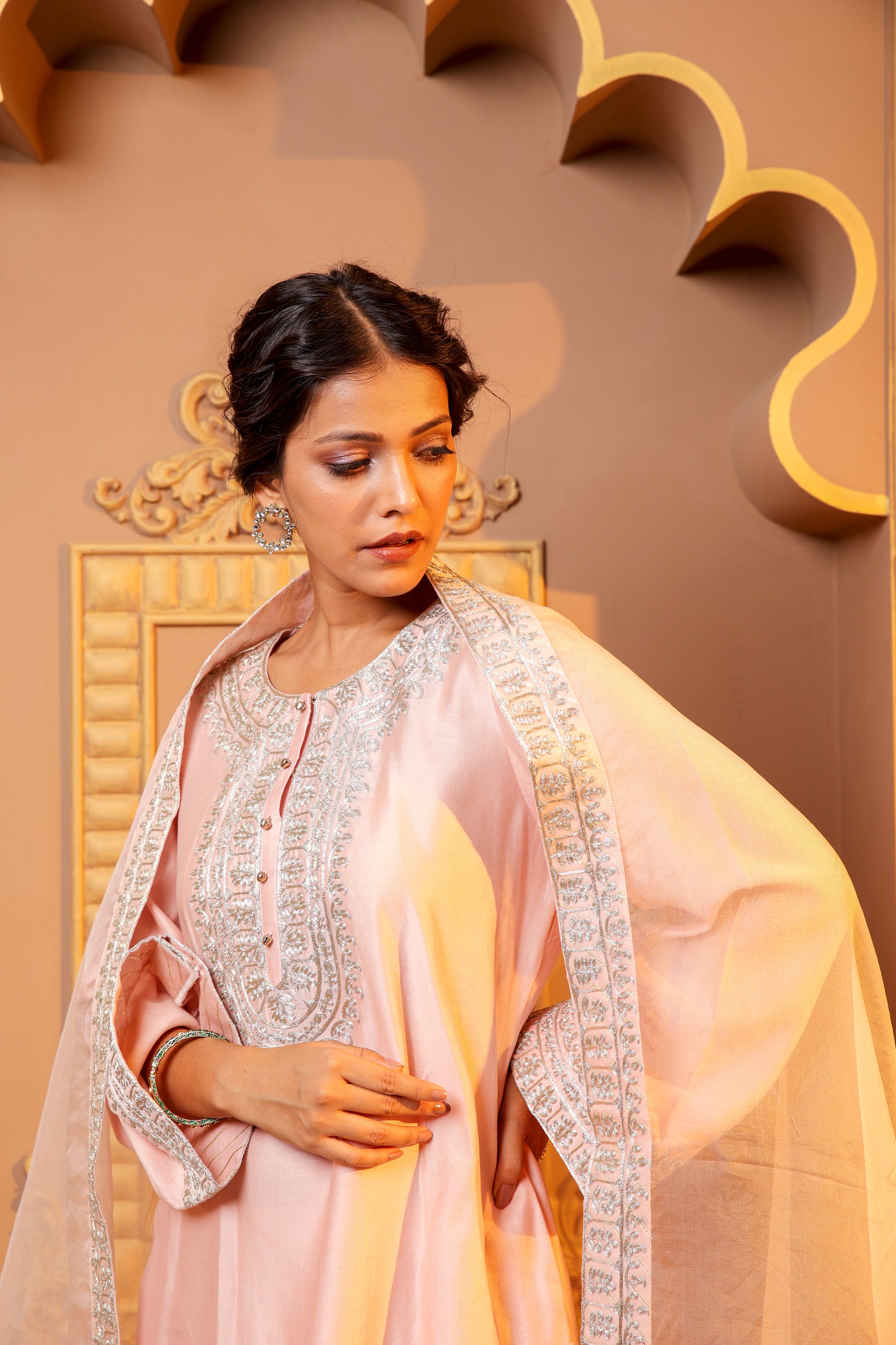 Embrace subtlety and grace with this charming blush pink salwar kameez set, featuring delicate embroidery on the neckline, sleeves, and hem. The soft hue and elegant design exude a refined charm, perfect for both daytime events and evening gatherings. The matching salwar pants are delicately embroidered to complement the overall look. Completing the set is an exquisitely embroidered dupatta, edged with a delicate silver border, enhancing the outfit's sophisticated appeal. Ideal for weddings, celebrations, and festive gatherings, this salwar kameez set ensures you radiate grace and elegance. The luxurious fabric guarantees comfort and style, making it a must-have for your ethnic collection.