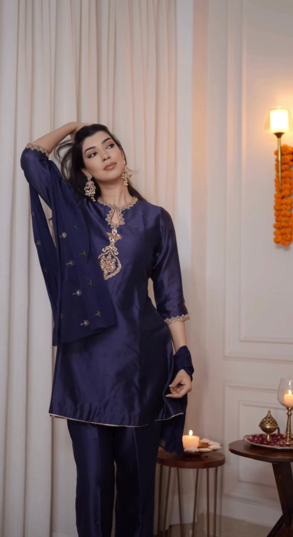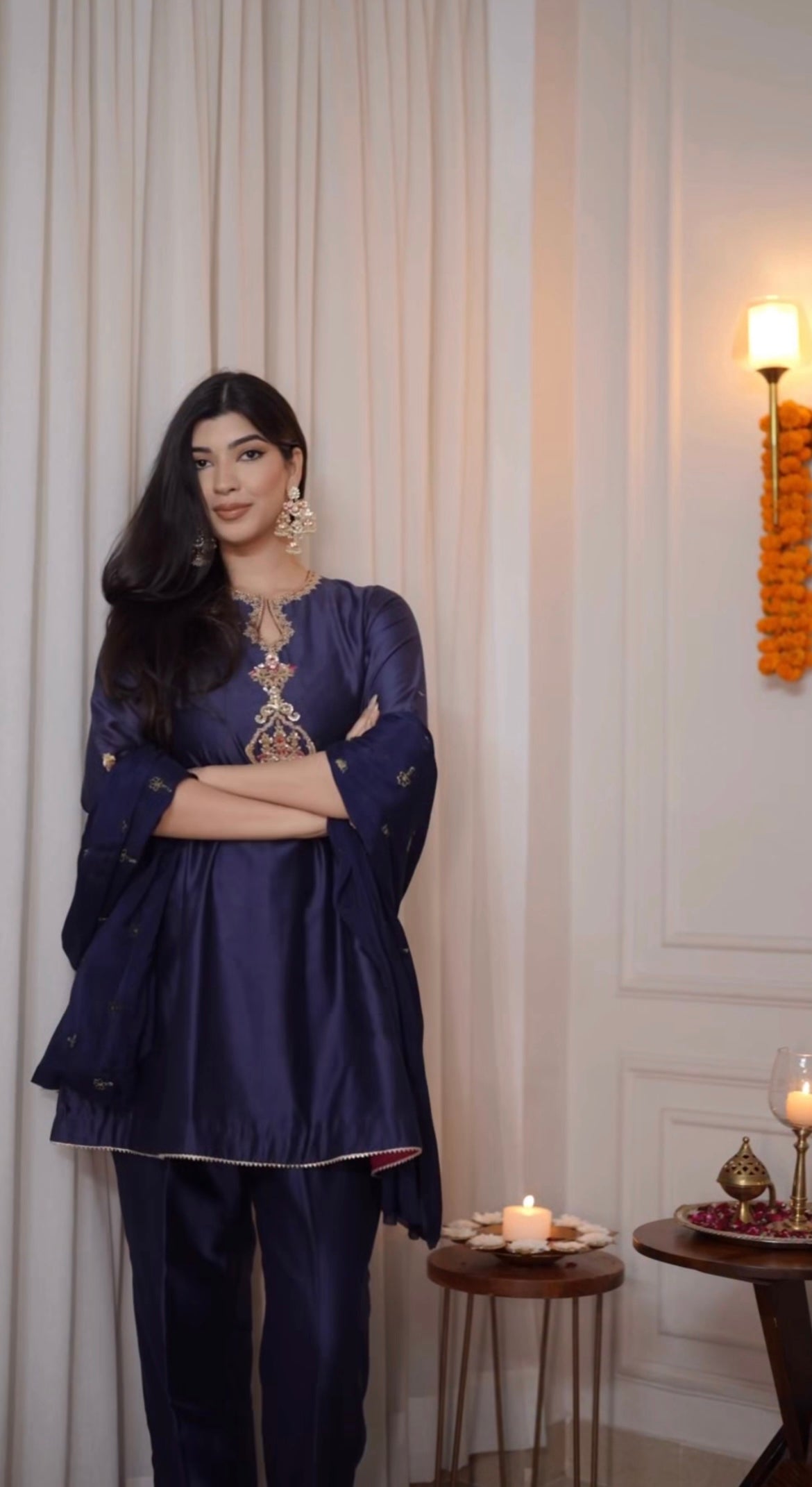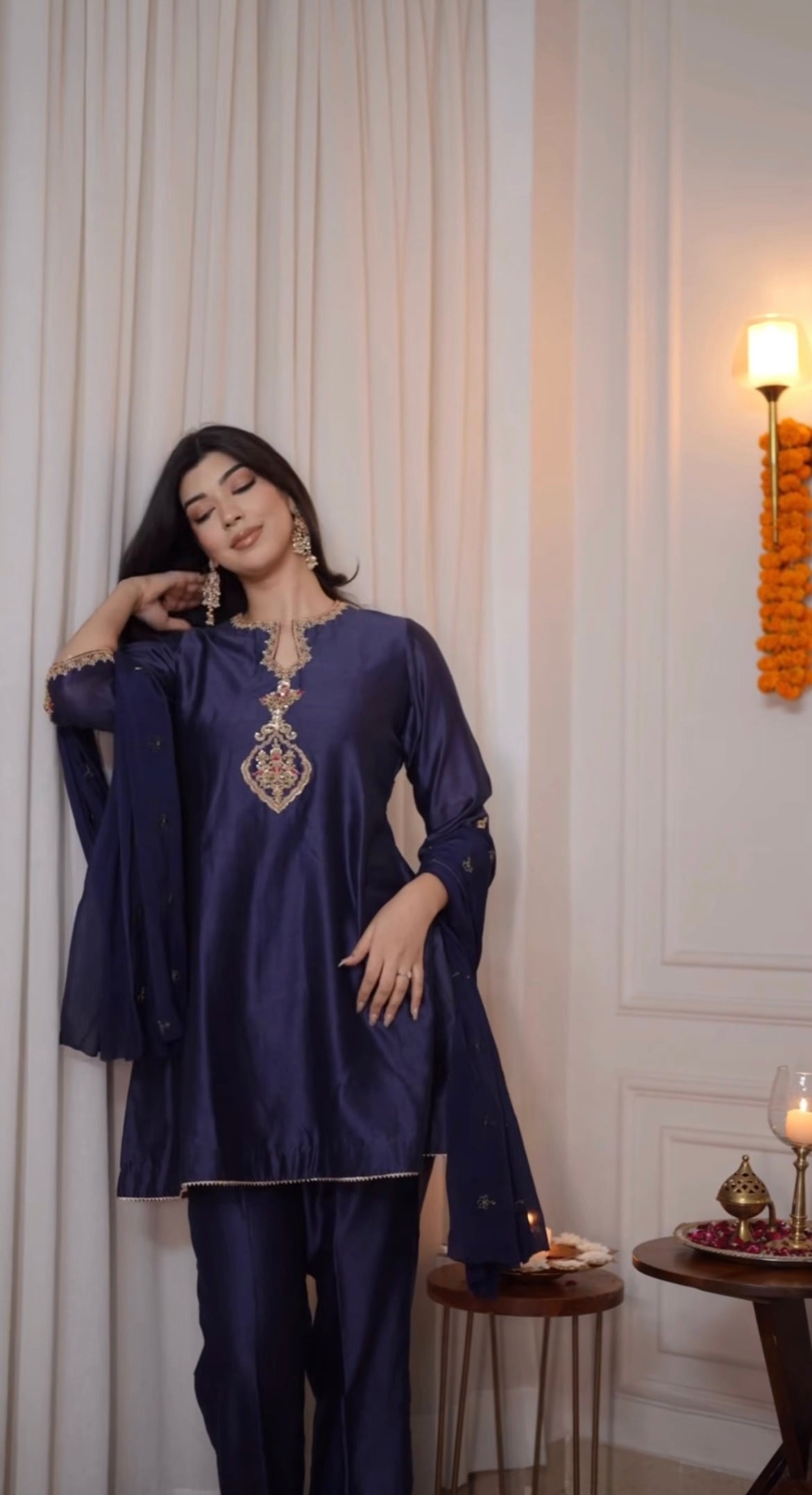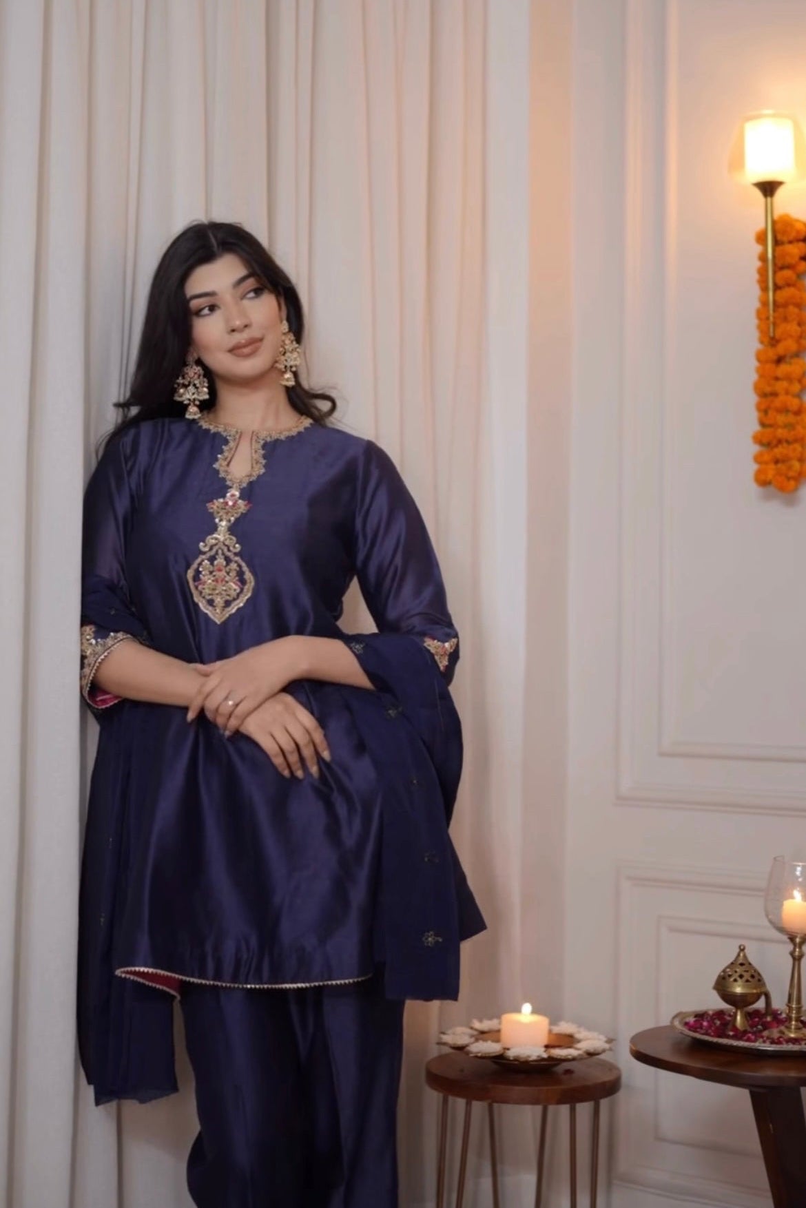 The Blue Keyhole Suit is bold yet refined, offering a flattering silhouette in rich silk chanderi with regal zardosi detailing. A standout pick for wedding receptions or festive nights under the stars.