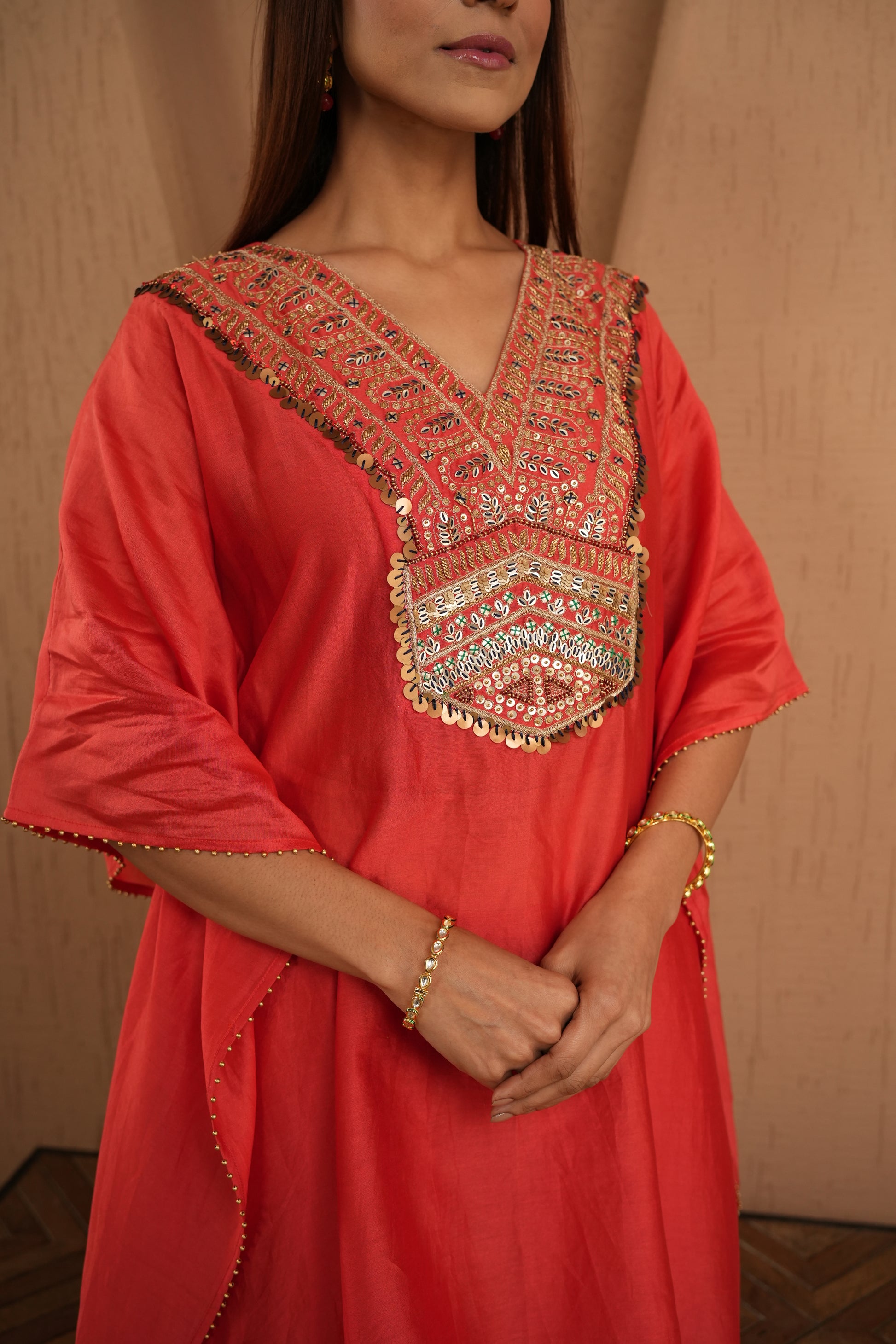 Designed for easy elegance, the saffron colored kaftan set is crafted in silk chanderi and accentuated with hand embroidery. Perfect for colourful mehendi brunches and festive travel wardrobes.