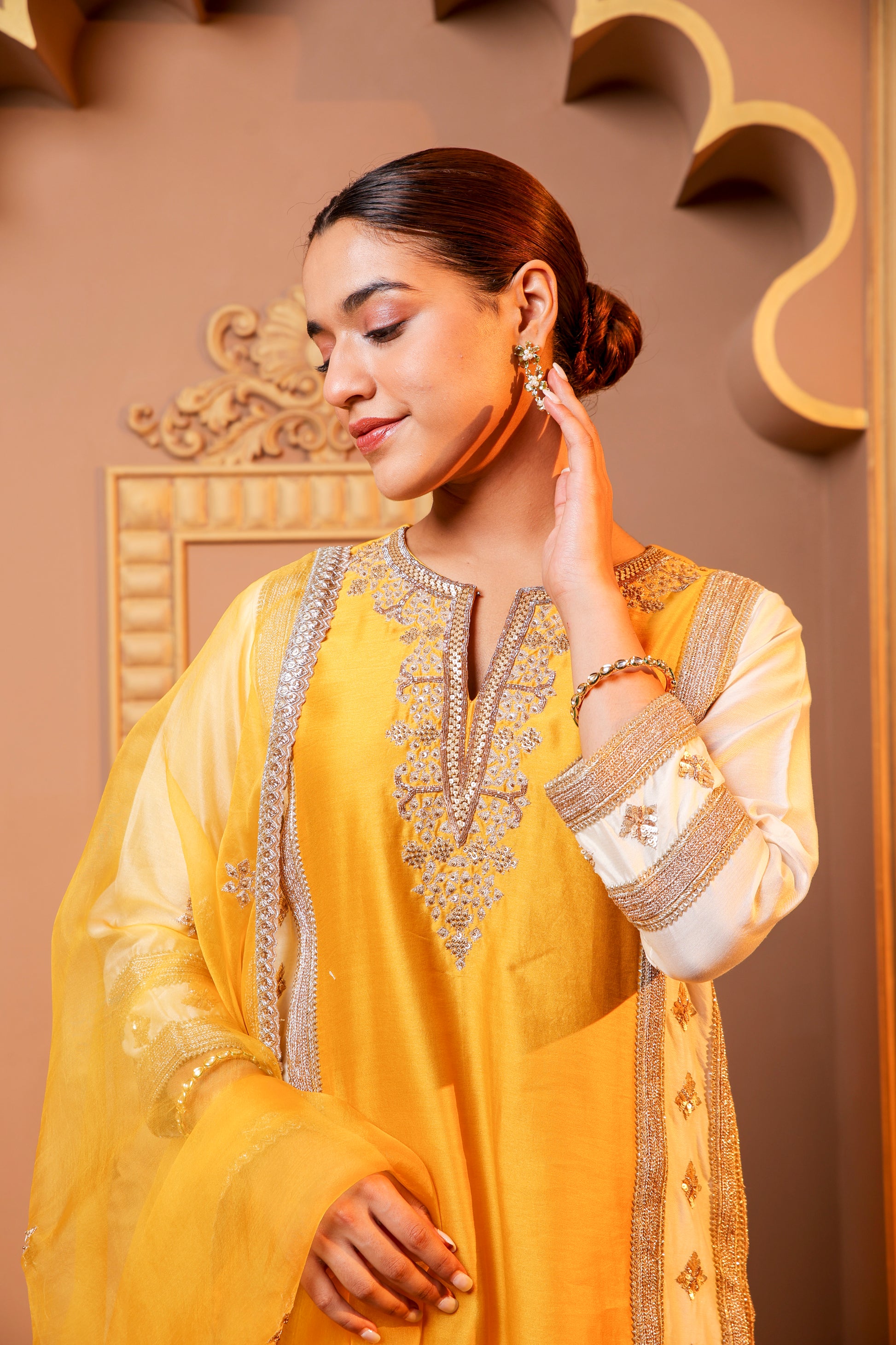 Embrace the sunshine with this vibrant yellow suit set, designed to bring out your radiant beauty. The kameez features intricate hand embroidery on the neckline, sleeves, and hem, adding a touch of elegance to the bright yellow fabric. The matching salwar pants are subtly embroidered to harmonize with the overall look. Completing the set is an exquisitely embroidered dupatta, edged with a delicate border, enhancing the outfit's festive appeal. Ideal for celebrations, weddings, and festive gatherings, this salwar kameez set ensures you stand out with its bold color and refined detailing. The luxurious fabric guarantees comfort and style, making it a must-have for your ethnic collection.